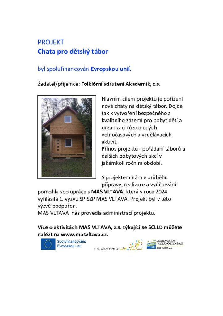 Projekt „Chata pro dětský tábor“ byl úspěšně zařazen do realizace Strategie rozvoje venkova území obcí MAS Vltava na období 2021–2027. Díky podpoře Evropské unie v rámci intervence 52.77 – LEADER se podařilo pořídit novou chatu, která zajistí bezpečné a kvalitní zázemí pro pobyt dětí i pro organizaci různorodých volnočasových a vzdělávacích aktivit.